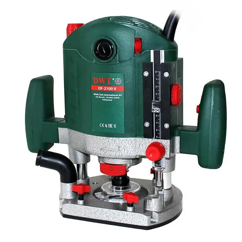Потужний фрезер DWT OF-2100 V виконаний з незмінною швейцарською якістю і призначений для виконання робіт з більш підвищеним навантаженням при обробці дерев'яних, пластикових і полімерних матеріалів шляхом фрезерування із застосуванням фрез різної конфігурації